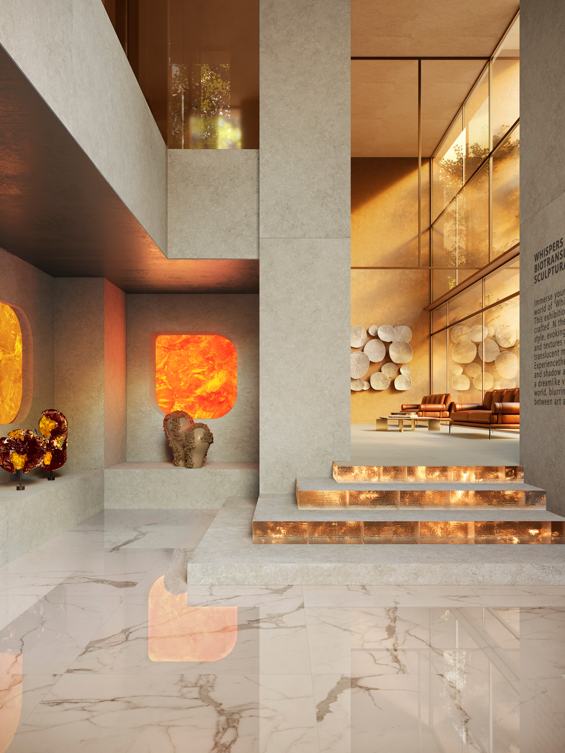 Wie in einer Skulptur von Michelangelo hat Cotto d’Este die reinsten Marmorsorten und Oberflächen erforscht, um die Maserungen des Steins zu einem zarten Zug der großen feinen Platten zu machen.
