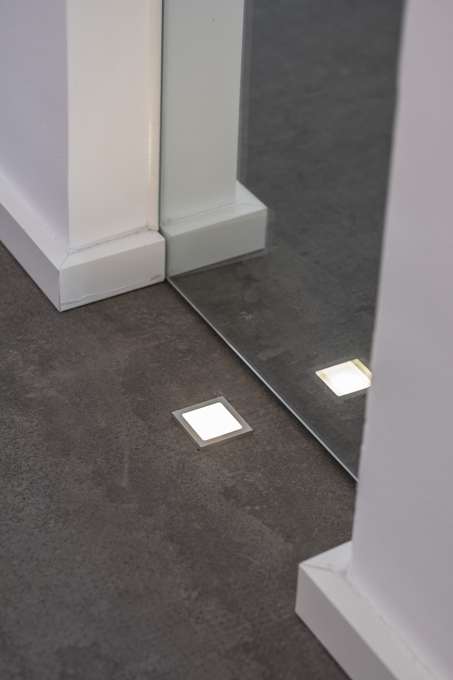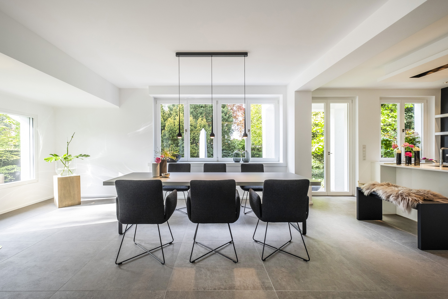 Für die lichtdurchflutete und von Natur umgebene Villa hat sich das Studio für Böden mit Betoneffekt entschieden. So hat es die Fliesen im Format 90 x 90 cm von X-Beton, Version Dot 70 ausgewählt. Eine von Walzbeton inspirierte Oberfläche, perfekt auf das Erdgeschoss des Gebäudes abgestimmt. Man entschied sich für den undurchsichtigen und plastischen natürlichen Farbton der Kollektion, mit einem leichten Patina-Effekt, der sie komfortabel und besonders weich macht. Bemerkenswert sind die wahrnehmbaren Tiefeneffekte beim Betrachten der Oberfläche, die alle Wohnbereiche mit ihrem eleganten und zarten taubengrauen Farbton einnimmt. Die Kollektion X-Beton gehört außerdem zur Linie PROTECT®, deren antibakterielle Eigenschaften – sie beseitigt bis zu 99,9 % der Bakterien rund um die Uhr – und beachtlichen Leistungen den Wohnraum geschützt und sicher machen.