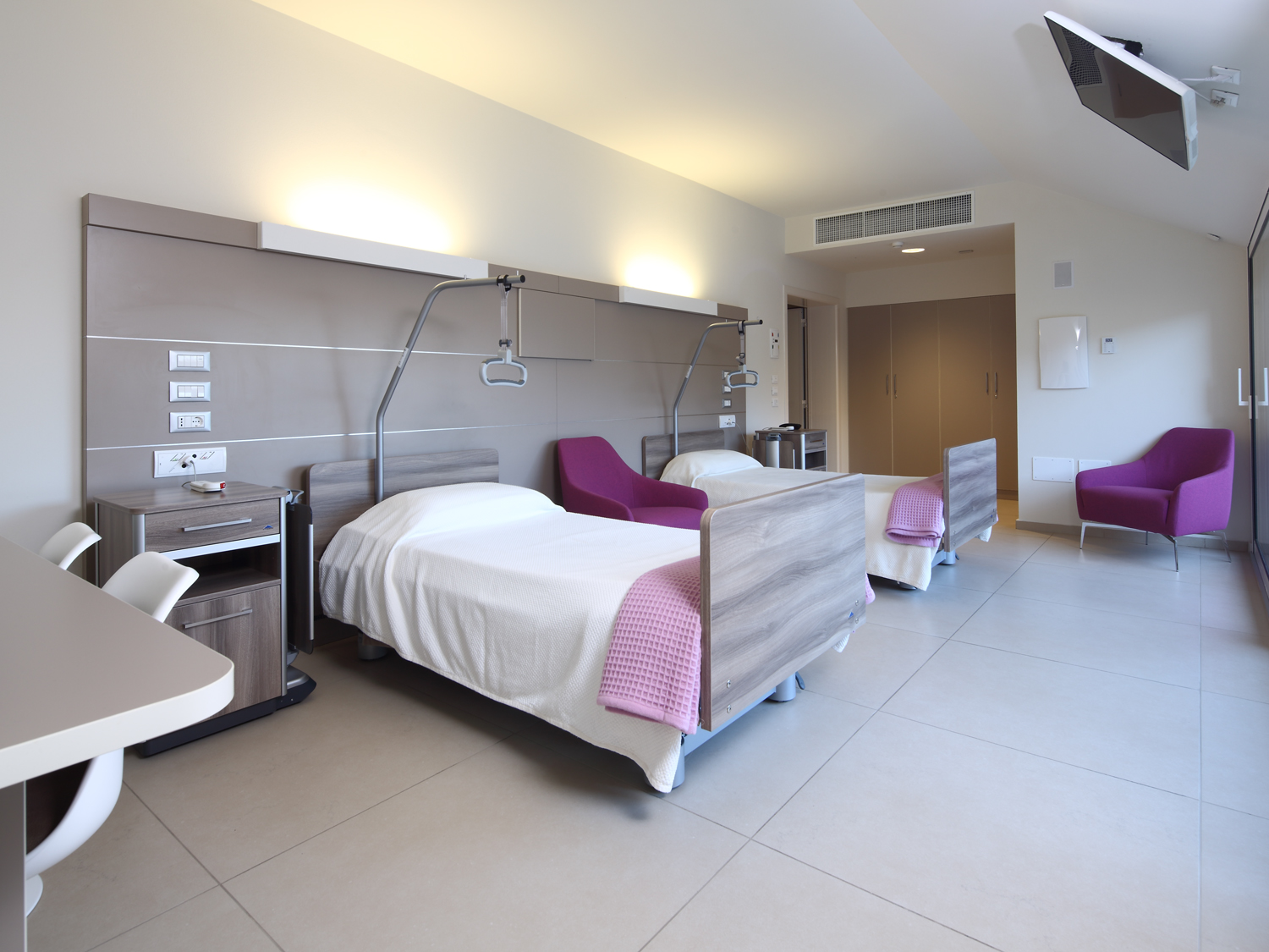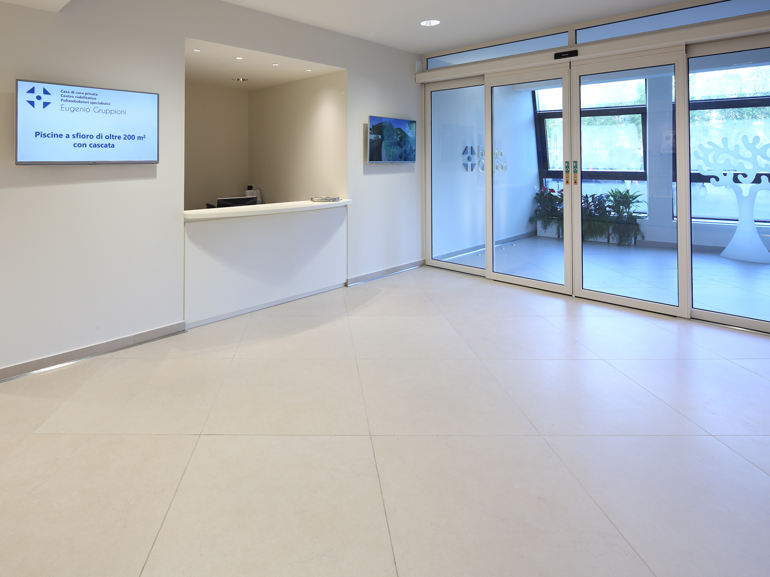 Die Böden und die Sockelleisten der Gänge, der Patientenzimmer und der Sanitäranlagen im Besucherbereich der Privatklinik wurden mit der Kollektion Buxy von Cotto d’Este in der zarten Nuance Amande verkleidet. Die Oberfläche dieser Linie mit intensiv natürlichem Look sorgt für Eleganz und Stil und macht die Räumlichkeiten besonders einladend, was in diesem so delikaten Kontext besonders wichtig ist. Außerdem machen die hochwertigen technischen Eigenschaften sie perfekt für Ambiente, wo die Pflege der Räume, die Aufmerksamkeit auf Sauberkeit und die Verschleißbeständigkeit von grundlegender Bedeutung sind. Mit einer auf lange Sicht garantierten Qualität halten die Oberflächen von Cotto d’Este hohen Beanspruchungen stand, ohne Schaden zu nehmen oder sich abzunutzen. Außerdem widerstehen sie selbst besonders aggressiven chemischen Substanzen.