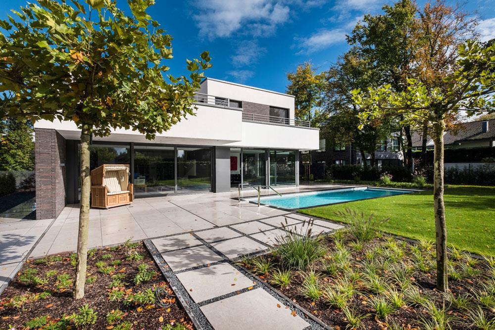Built in Königshardt, an airy residential district in the German city of Oberhausen, that lies in the heart of the Ruhr, the villa designed by German practice Engelshove Architekten redefines traditional rationalist standards through a minimalist language that pays meticulous attention to detail. The main body of the two-storey building, crowned with a classic flat roof, is composed of a series of primary shapes: a play of rectangular boxes in which solid portions of concrete with a rigorously white finish alternate with large, fullheight areas of glazing that flood the interiors with natural light, opening them onto the garden. Volumes are set back at the upper level in a carefully calibrated way, which augments compositional dynamism and creates large terraces overlooking the green surroundings.